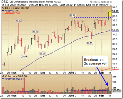 O'Neil and his research team has not officially released how ETF's trade with CANSLIM rules, today's IBD featured DBC in the Exchange Traded Funds section, because it had all the great qualities of a CANSLIM stock. Flat base breakout on 2x average volume, record demand and price levels for wheat and other commodities, and great relative strength compared to the major indices. In fact, according to the article, commodities are not directly correlated with the market, which makes DBC an attractive buy during this choppy, correcting environment. Here's DBC breakdown: