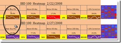 Leadership makes or breaks the market, and my indicator of market health is the IBD 100, which has started to show some strength. The percentage of stocks near buy points increased from 16 - 23%, and the heat map is showing better coloring (less red) since last Friday.